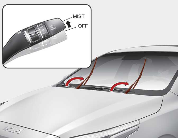 엔진 시동을 끈 후 20초 이내에 와이퍼가 최상단으로 올라갈 때까지 와이퍼 스위치를 2초 이상 「MIST」위치로 올리십시오.