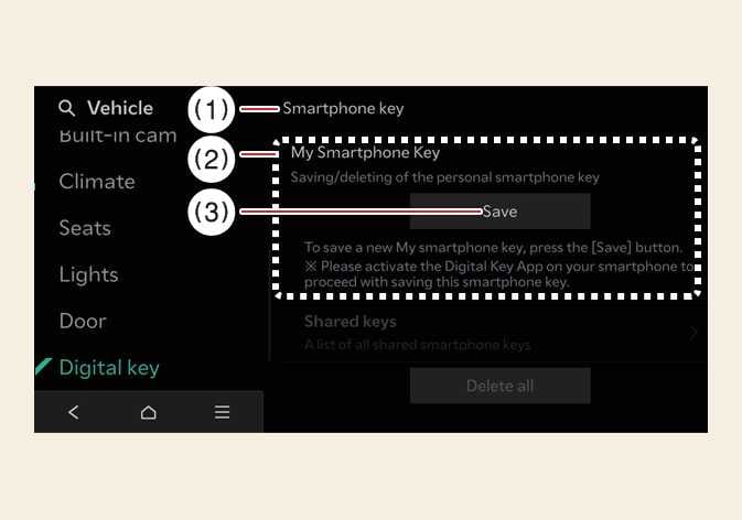 Als er al een digitale sleutel (smartphone) in het voertuig is opgeslagen, wordt Alles verwijderen weergegeven op het menuscherm van de Smartphone-sleutel van het infotainmentsysteem en Verwijderen op het scherm My Smartphone Key. Als u een digitale sleutel opnieuw wilt opslaan, Uw digitale sleutel verwijderen (smartphone).