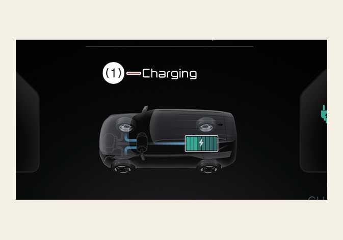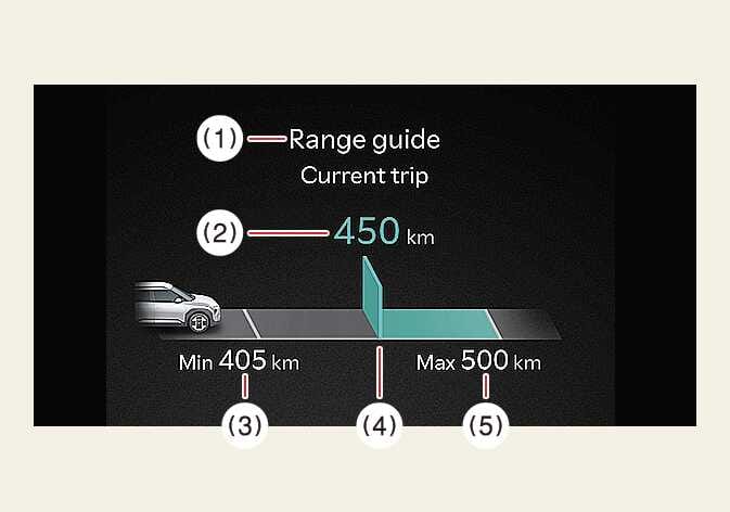 De Actieradiushulp helpt bestuurders zuinig te rijden. De Actieradius (2) wordt bepaald door historische rijgegevens en de huidige laadstatus van de batterij te analyseren. De ‘geschatte actieradius’ wordt berekend op basis van het gemeten energieverbruik sinds het begin van deze rit en de resterende batterij. Het energiebesparingsniveau voor deze rit wordt visueel aangegeven met een groene of oranje balk (4). De lengte van de balk is evenredig met de mate van energiebesparing.