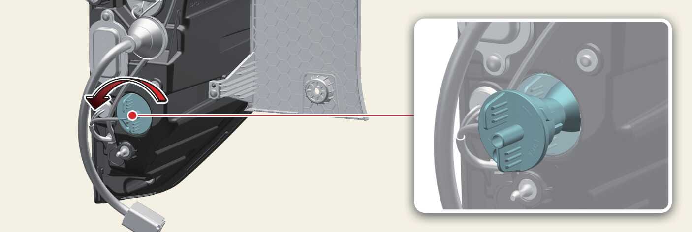 Verwijder de fitting uit de lichtunit door deze linksom te draaien tot de nokjes van de fitting in lijn liggen met de uitsparingen van de lichtunit. Trek de lamp uit de fitting.