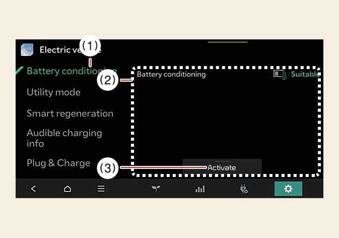 Batterikonditioneringsläget är effektivt på vintern när högspänningsbatteriets temperatur är låg. Det här läget rekommenderas för att förbättra körningens och likströmsladdningens prestanda under vintern. Körsträckan kan dock minskas eftersom mer energi krävs för att öka batteritemperaturen.