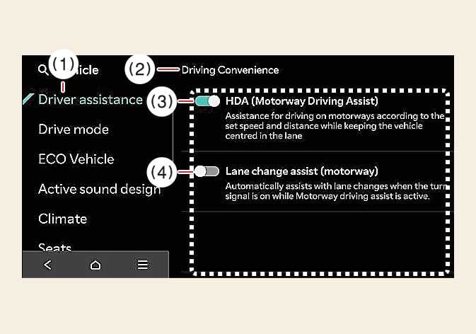 Om Motorvägskörningsassistans (HDA) är valt, hjälper det dig bibehålla inställd hastighet och inställt avstånd till framförvarande fordon, samt hjälper till att centrera bilen i körfältet.
