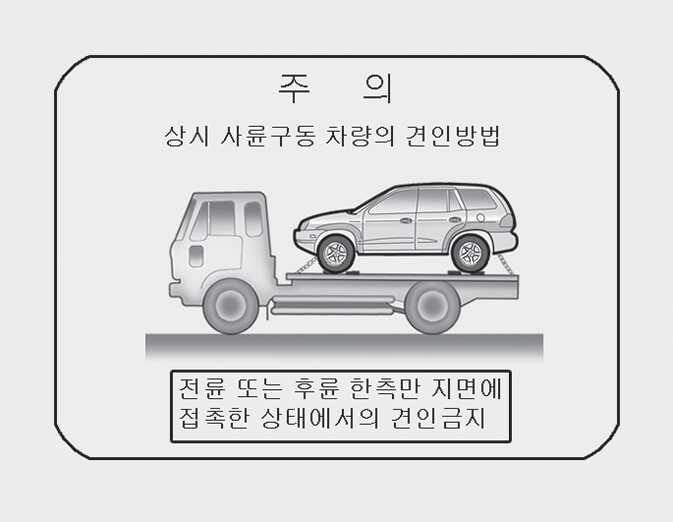 상시 4륜 구동 차량은 보통의 견인 트럭으로 견인할 수 없습니다. 반드시 4륜을 들어 올려 견인하십시오.