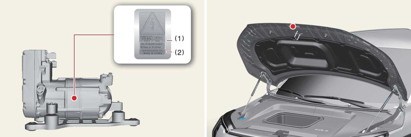 Die Kennzeichnung des Klimaanlagenkompressors enthält Informationen über die Art des Kompressors, mit dem Ihr Fahrzeug ausgestattet ist, d.h. Modell, Herstellerartikelnummer, Produktionsnummer, Kältemittel (1) und Kältemittelöl (2).
