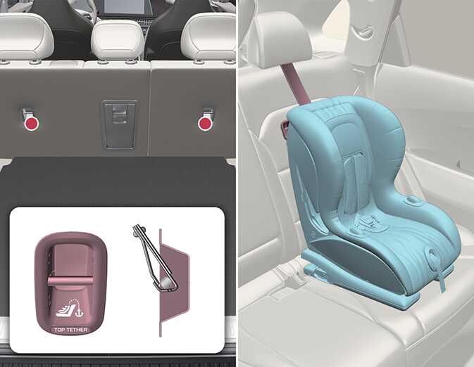상부 부착구를 이용할 때 OCV031027L_2 설치 방법 어린이 보조 좌석의 벨트를 뒷좌석 등받이 뒤로 넘기십시오. 어린이 보조 좌석 벨트의 고리를 상부 부착구에 확실히 고정하십시오.
