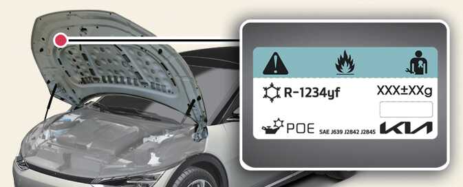 이 차량은 친환경적인 신냉매 R-1234yf가 적용되어 있습니다. 신냉매는 기존에 적용되어 있던 구냉매 R-134a와 대비하여 지구 온난화 현상을 크게 줄일 수 있습니다. 실제 차량에 사용된 냉매 종류와 용량을 알 수 있도록, 후드 안쪽에 사양 라벨이 부착되어 있습니다.