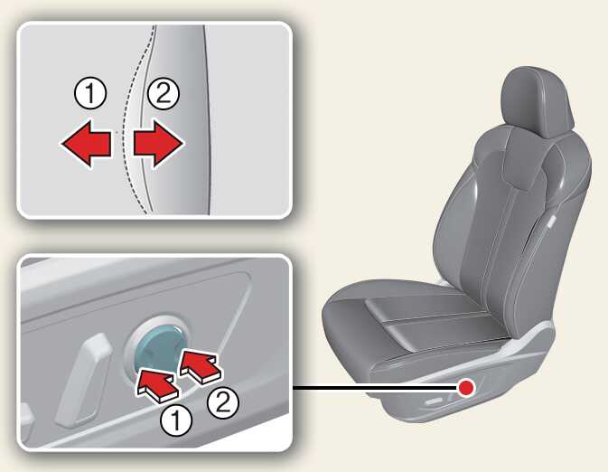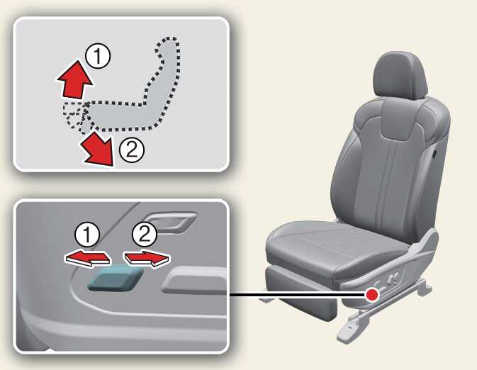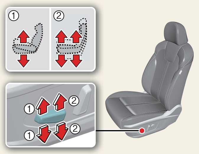 조절 스위치의 앞쪽(1)을 올리거나 내리면 좌석의 앞부분이 올라가거나 내려오고, 조절 스위치의 뒤쪽(2)을 올리거나 내리면 좌석 전체가 올라가거나 내려옵니다.
