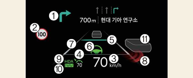설명을 위한 샘플로 실제 차량에 적용된 헤드업 디스플레이 형상과 다를 수 있습니다.