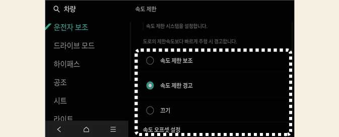 시동 「ON」 상태에서 인포테인먼트 시스템의 설정 → 차량 → 운전자 보조 → 속도 제한을 차례로 선택하십시오. 각 기능의 사용 여부를 설정할 수 있습니다.