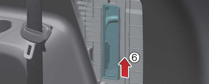 트렁크룸 우측에 있는 후석 에어컨 전용 에어필터 커버의 후크(1)를 위로 밀어 누르십시오. 이 상태에서 커버를 앞으로 당겨 분리하십시오(2).