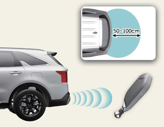 테일게이트 후방 약 50~100 cm 이내에 스마트키가 감지되면 웰컴 경보가 작동하면서 기능이 작동됩니다.