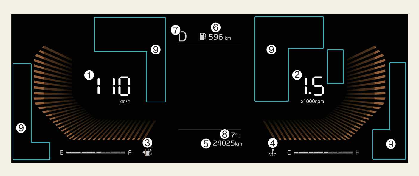 예시된 클러스터 형상과 LCD 표시창의 내용은 실제 차량의 형상 및 내용과 상이할 수 있습니다.