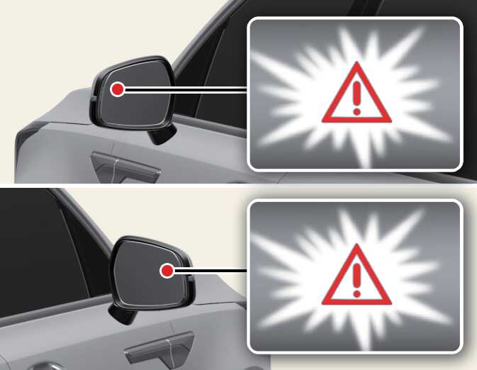 사이드 미러(실외 미러) 경고등이 깜빡이고 클러스터 등에 경고문이 표시됩니다.