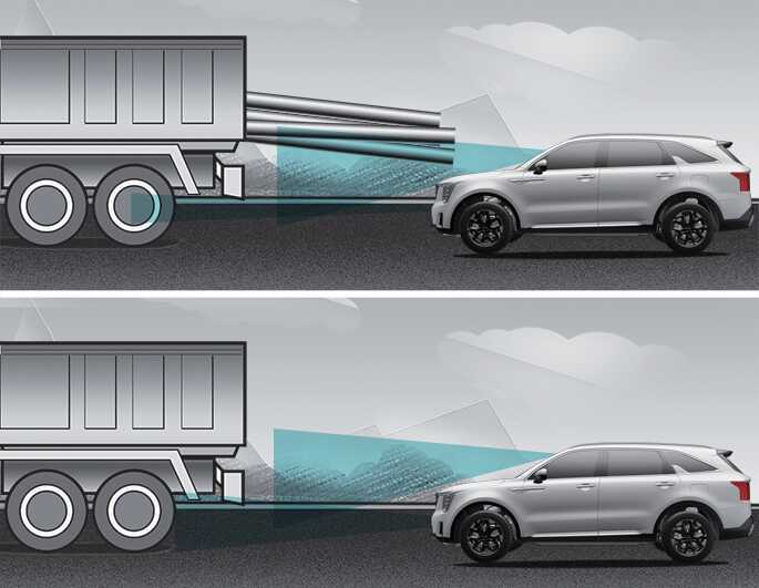 OMQ4053007_20다음과 같은 경우에는 선행 차량을 인식하지 못할 수 있습니다. 항상 전방 도로 상황 및 주행 상태를 확인하고 주의하여 운전하십시오. 필요하면 직접 속도를 조절하십시오.