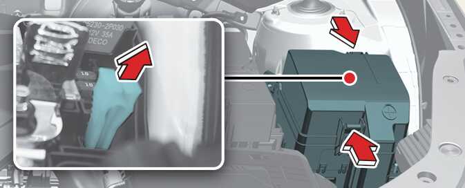 시동을 끈 상태에서 모든 전기 장치 스위치를 끈 후, 엔진룸 퓨즈 박스에 설치된 퓨즈 교체용 클립(퓨즈 뽑개)으로 단선된 퓨즈를 제거하고 같은 용량의 예비 퓨즈를 손으로 단단히 삽입하십시오.