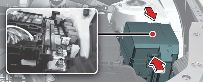 엔진룸 퓨즈 박스 커버를 닫을 시 락킹음 확인을 통해 커버 닫힘을 확인하십시오. 엔진룸 퓨즈 박스 커버가 정상 체결되지 않으면 수분 유입으로 인한 전자 장치의 비정상 작동이 발생할 수 있습니다.