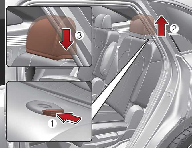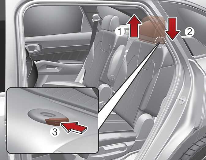 To raise the headrest, pull it up to the desired position (1). To lower the headrest, push and hold the release button (3) on the headrest support and lower the headrest to the desired position (2).