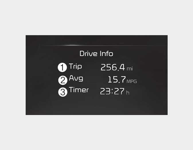 This display shows the trip distance (1), the average fuel efficiency (2), and the total driving time (3) information once per one ignition cycle.