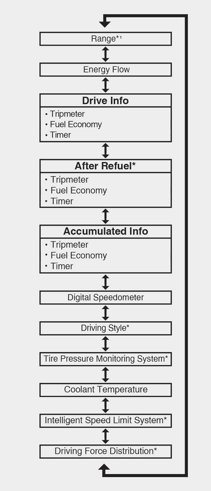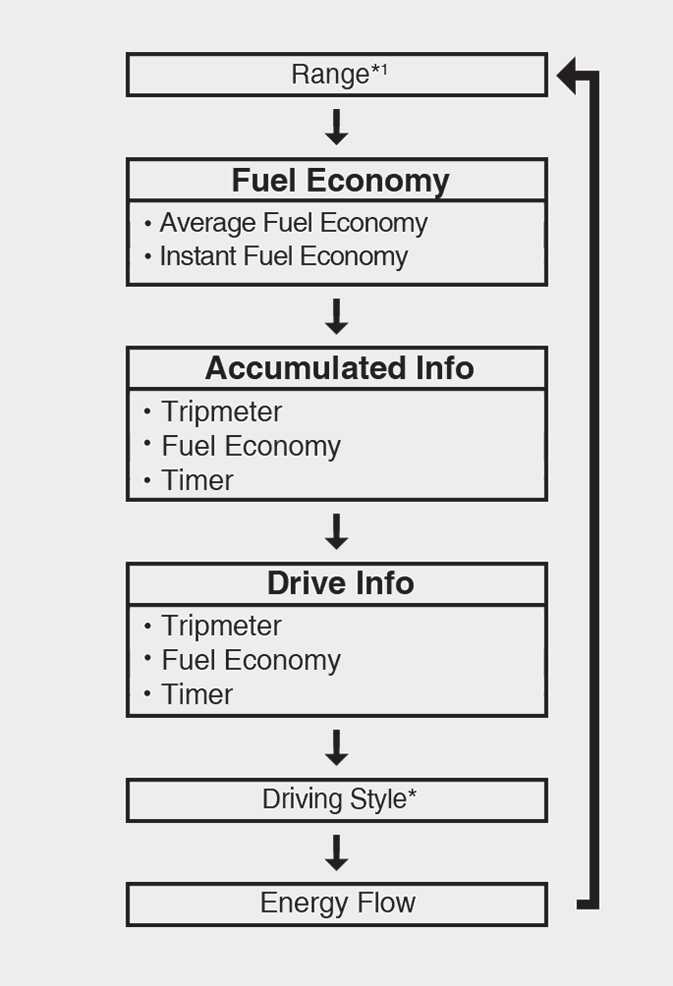 This display shows the trip distance, the average fuel efficiency, and the instant fuel efficiency (or the total driving time) since refueling.