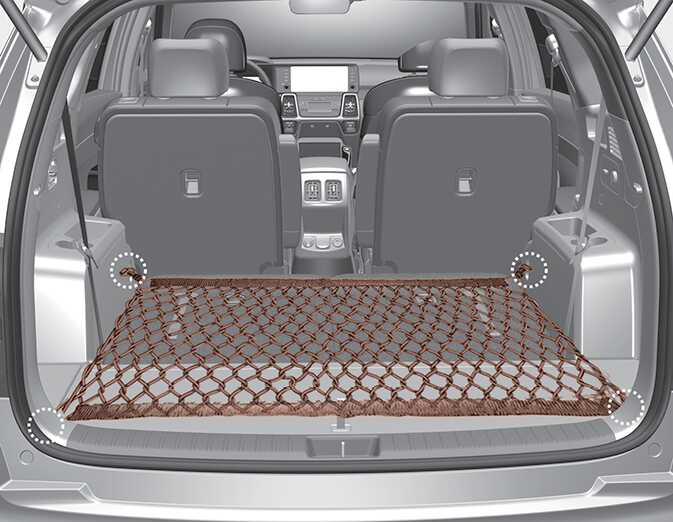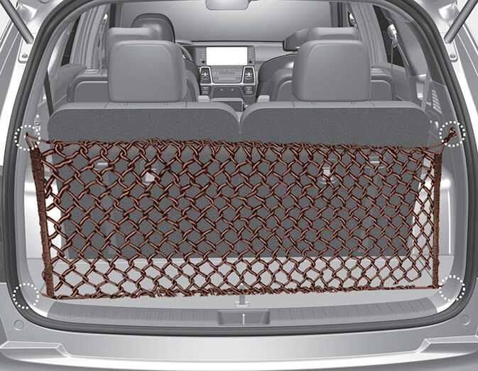 To keep items from shifting in the cargo area, you can use the 4 holders located in the cargo area to attach the luggage net (if equipped), or you can fold the luggage net into half and attach it upwards by using the additional 2 holders located on each side.