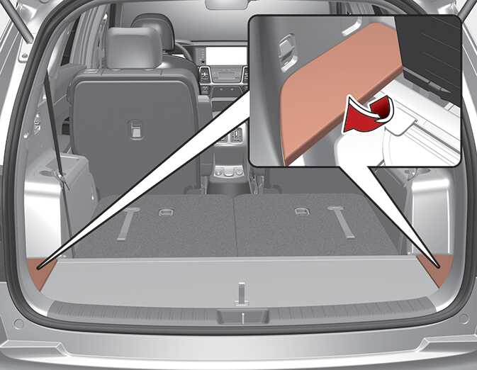 Luggage side tray: (if equipped) The luggage side tray can be used for storing small items. OMQ4AH040484 To open the cover, pull up the handle and lift the cover.