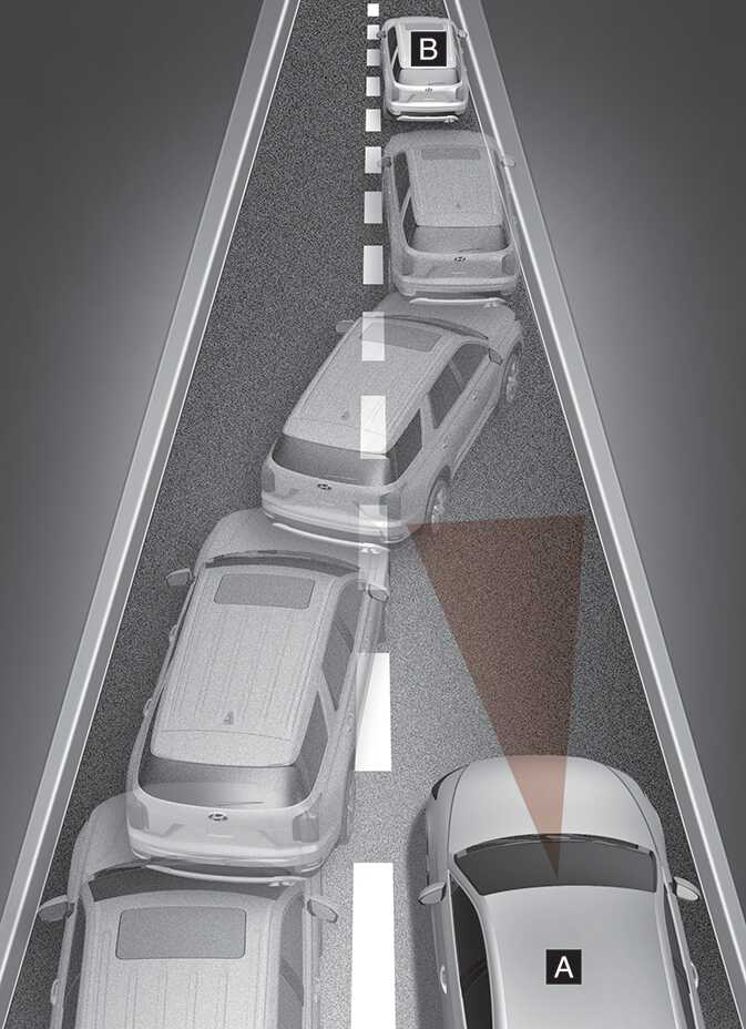 When a vehicle [B] moves into your lane from an adjacent lane, it cannot be detected by the sensor until it is in the sensor's detection range. Forward Collision-Avoidance Assist may not immediately detect the vehicle when the vehicle changes lanes abruptly. In this case, you must maintain a safe braking distance, and if necessary, steer your vehicle and depress the brake pedal to reduce your driving speed in order to maintain a safe distance.