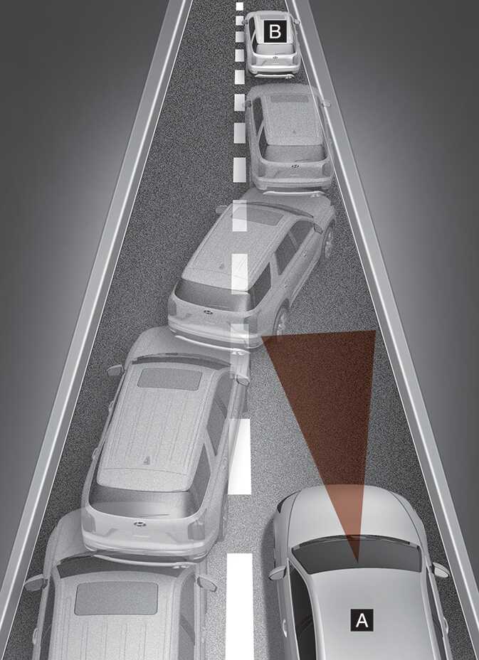 When a vehicle [B] moves into your lane from an adjacent lane, it cannot be detected by the sensor until it is in the sensor's detection range. Forward Collision-Avoidance Assist may not immediately detect the vehicle when the vehicle changes lanes abruptly. In this case, you must maintain a safe braking distance, and if necessary, steer your vehicle and depress the brake pedal to reduce your driving speed in order to maintain a safe distance.