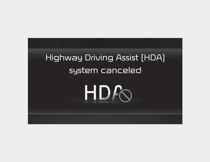 If the driver still does not have their hands on the steering wheel after the hands-off warning, the 'Highway Driving Assist (HDA) canceled' warning message will appear.