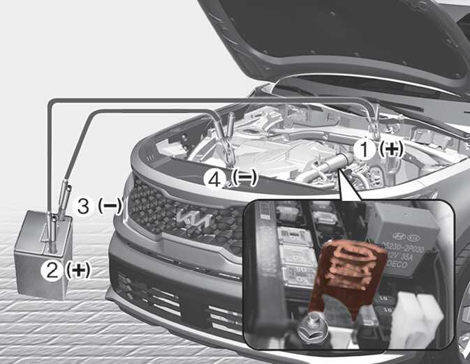 Do not allow the (+) and (-) jumper cables to touch. It may cause sparks.