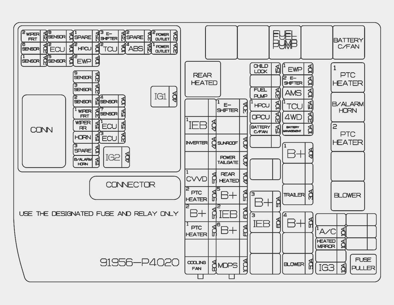 ICU Junction Block (Fuse - AMP, OBC, IG3 1, S/HEATER (FRT), P/WINDOW (RH), 2nd ROW SEAT FOLDING (LH)) |
