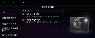 인포테인먼트 시스템 홈 화면에서 빌트인 캠을 선택한 후, '빌트인 캠 설정 → 녹화'를 차례로 선택하십시오. 주행 및 주차 시 녹화 방법을 선택할 수 있습니다.