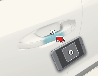 NFC 안테나가 있는 스마트폰의 뒷면을 운전석 또는 동승석 도어 손잡이 인증 패드(A)에 약 2초 이상 대십시오.