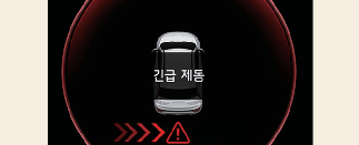 긴급 제동에 의한 정차 시 클러스터 등에 경고문이 표시됩니다. 안전을 위해 즉시 브레이크 페달을 밟고 주변 상황을 확인하십시오.