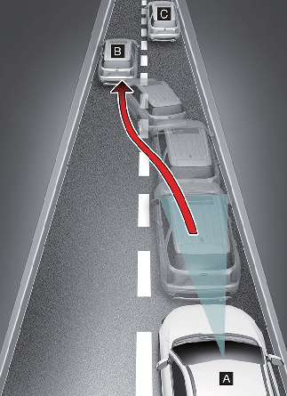 옆 차로의 차량[B] 및 이륜차가 자차[A]와 같은 차로로 차로를 변경할 때 센서의 감지 범위 안으로 들어올 때까지 차량[B] 및 이륜차를 인식하지 못할 수 있습니다. 갑자기 끼어드는 차량 및 이륜차는 센서가 늦게 인식할 수 있습니다. 항상 전방 도로 상황 및 주행 상태를 확인하고 주의하여 운전하십시오. 필요하면 브레이크 페달을 밟아 직접 속도를 조절하거나 스티어링 휠을 조작하십시오.