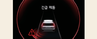 충돌방지 보조에 의한 정차 시 클러스터 등에 경고문이 표시됩니다. 안전을 위해 즉시 브레이크 페달을 밟고 주변 상황을 확인하십시오.