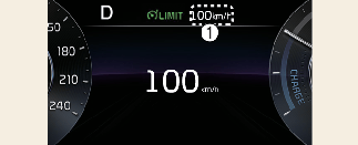 설정한 제한속도가 클러스터에 표시됩니다. 만약, 설정한 속도 이상으로 주행하려면 킥다운 장치가 작동할 때까지 가속 페달을 세게 밟아야 합니다. 주행 속도가 설정한 제한속도로 내려올 때까지 설정한 속도 표시등(1)이 깜빡이며 일정 시간 경고음이 울립니다.