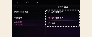 속도 오프셋 설정: 제한속도의 오프셋을 설정합니다. 도로의 제한속도에 속도 오프셋 값을 더한 속도를 기준으로 과속을 경고하고 설정속도를 변경합니다.