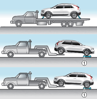 견인하는 가장 좋은 방법은 견인 차량에 차량을 실어 운반하는 상차 견인이며 상차 견인이 불가할 경우에는 앞 또는 뒷바퀴를 지그에 올리고 나머지 타이어를 지면에 닿지 않도록 돌리(1)를 사용하여 견인하십시오.