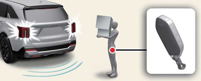 OMQ4A033004If you are positioned in the detecting area (20 ~ 40 in [50 ~ 100 cm] behind the vehicle) carrying a smart key, the hazard warning lights will blink and chime will sound to alert you the smart key has been detected and the liftgate will open.