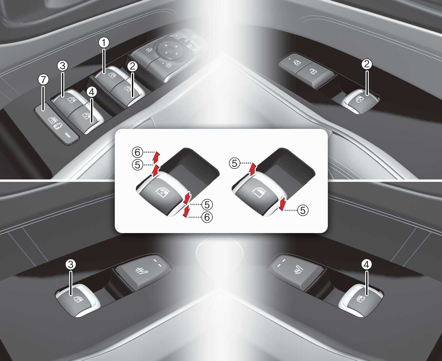 Each door has a power window switch that controls the door's window. The driver has a power window lock button which can block the operation of rear passenger windows. The power windows can be operated for approximately 3 minutes after ENGINE START/STOP button turned to the ACC or LOCK position. If the front doors are opened, the power windows cannot be operated even within the 3 minutes period.