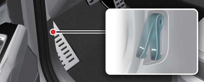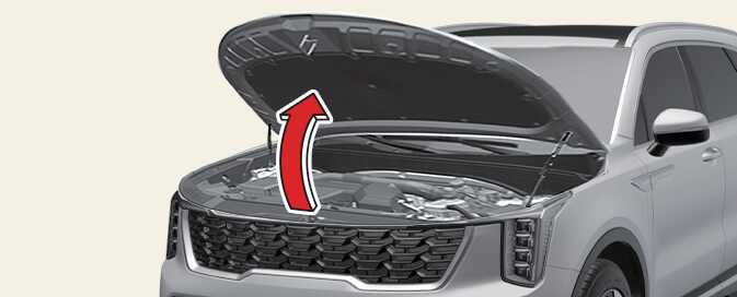 Go to the front of the vehicle, raise the hood slightly, push the secondary hood release lever (1) to the left and lift the hood (2).