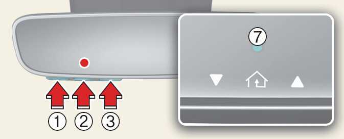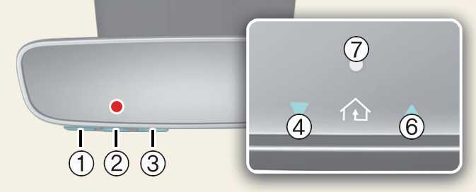 If the indicator (4) or (6) does not turn to green, it indicates that the last status of garage door was not received properly. The HomeLink mirror tries to receive the last known status of the garage door for a few seconds.