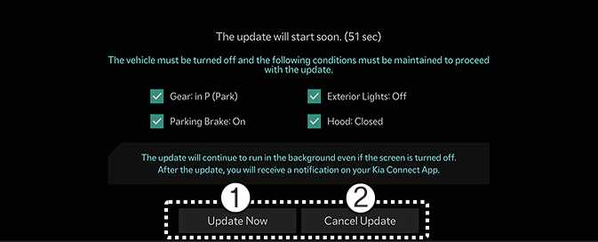If you press the Start button on the screen, the vehicle will begin installing the update automatically. The following conditions must be satisfied: