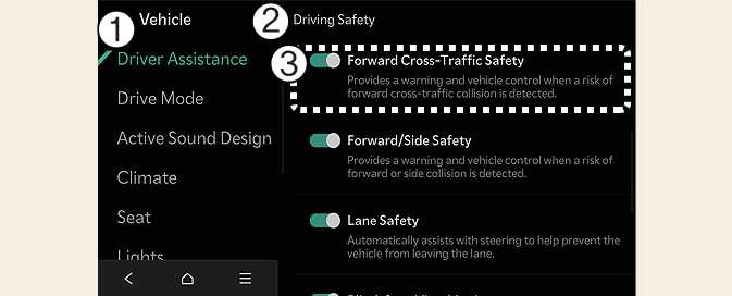 With the vehicle on, select Setup → Vehicle → Driver Assistance → Driving Safety → Forward Cross-Traffic Safety from the infotainment system screen to turn on Junction Crossing function and deselect to turn off the function.
