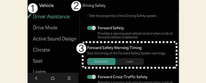 With the vehicle on, select Setup → Vehicle → Driver Assistance→ Driving Safety → Forward Safety Warning Timing on the infotainment system to change the initial warning activation timing of Forward Collision-Avoidance Assist.