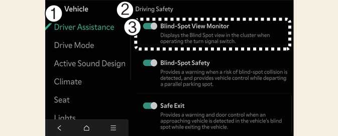 With the vehicle on, select Setup → Vehicle → Driver Assistance → Driving Safety → Blind-Spot View Monitor from the infotainment system screen to turn on Blind-Spot View Monitor and deselect to turn off the function.