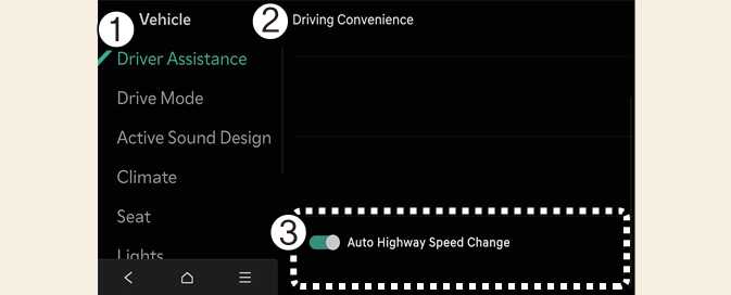 With the vehicle on, select Setup → Vehicle → Driver Assistance → Auto Highway Speed Change on the infotainment system.