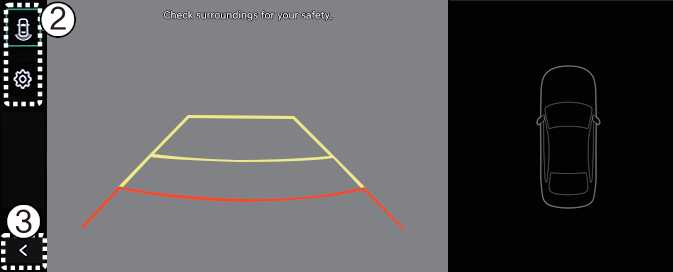 Pressing the View switching button (2) with the Rear top view on the screen allows you to select rear top view, rear-view, or rear wide view.