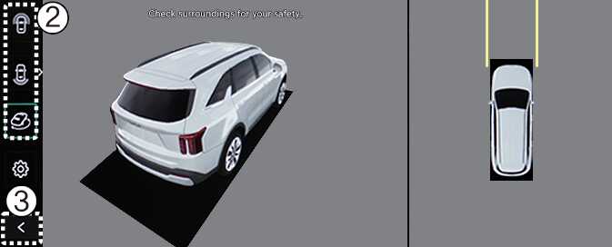 3D view function shows the vehicle in various angles. Press the 3D view icon on the Surround View Monitor screen to choose the angle. Press the 3D view icon again to reset the angle.