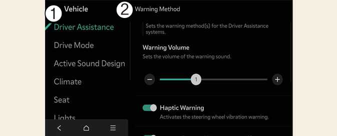 The Warning Methodscan be set with the vehicle on. Select Setup → Vehicle → Driver Assistance → Warning Methods from the settings menu in the infotainment system to change the following settings